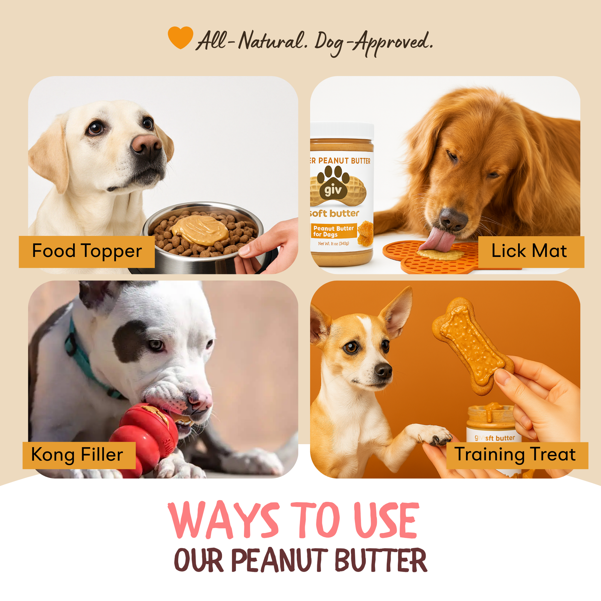 Many human brands of peanut butter contain salt, sugar, oils, or other flavorings. giv dog butter is unsalted human peanut butter, made with only 2 ingredients, peanuts and honey.