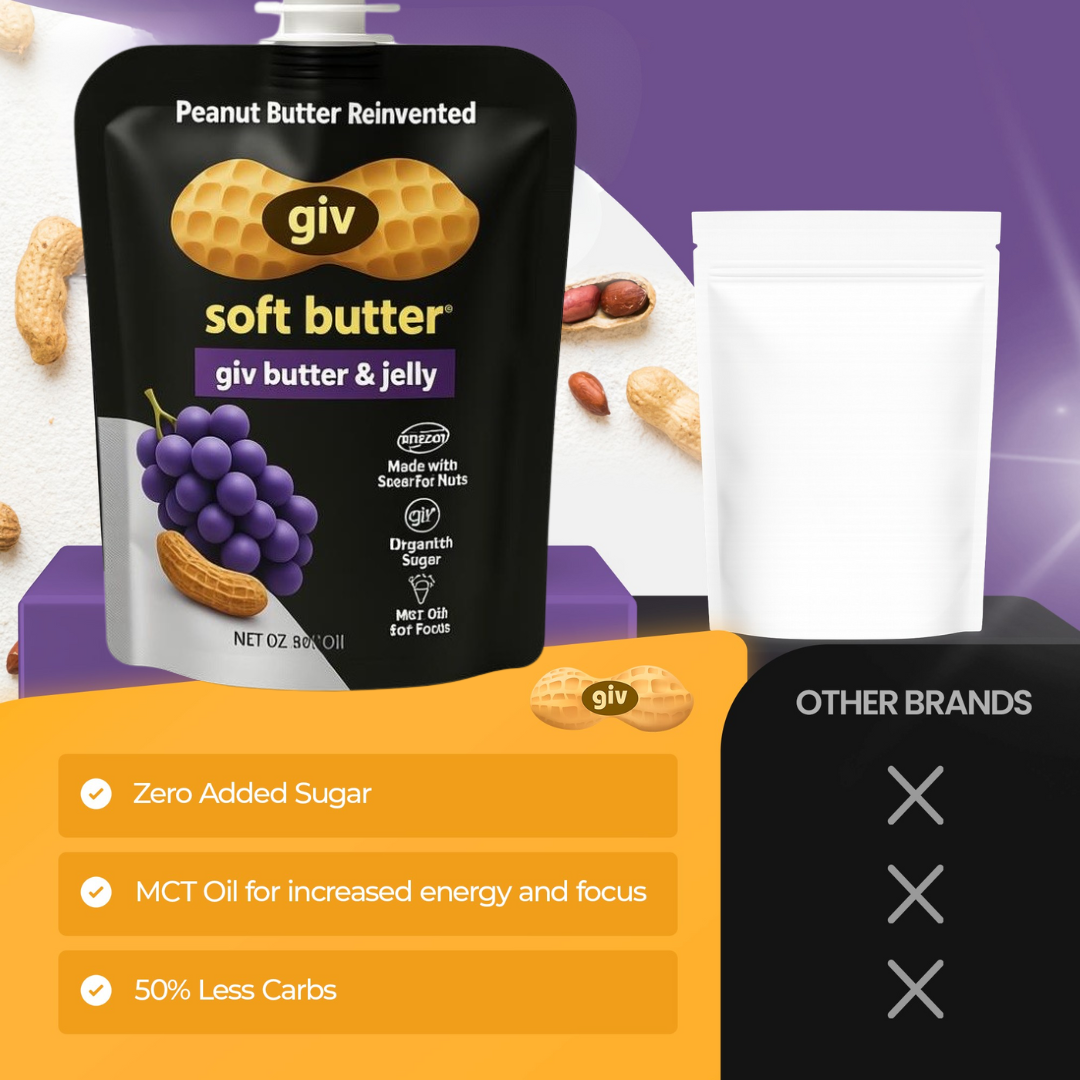 Peanut butter reinvented. gb&j the new way. Classic Peanut Butter of roasted peanuts blended with pecans infused with Concord grape and MCT oil, creates a rich, sweet and salty, mouth watering, familiar comfort food, but with the added benefits of MCT oil for energy and focus. With no added sugar, this vegan and gluten-free organic peanut butter is glp-1 friendly, low carb and keto and diabetic friendly. 2oz pouches.