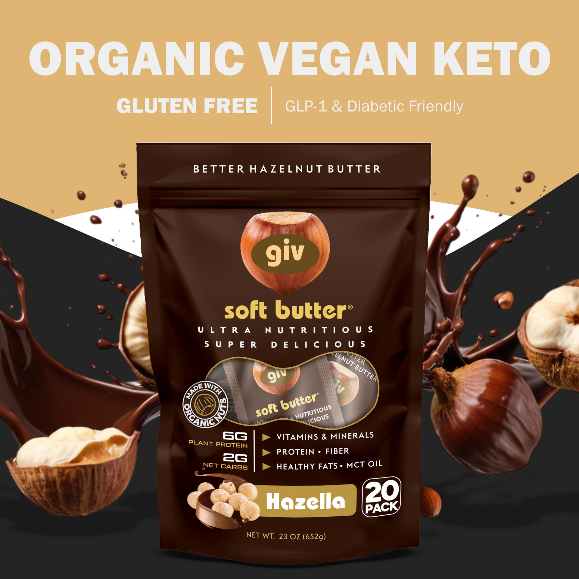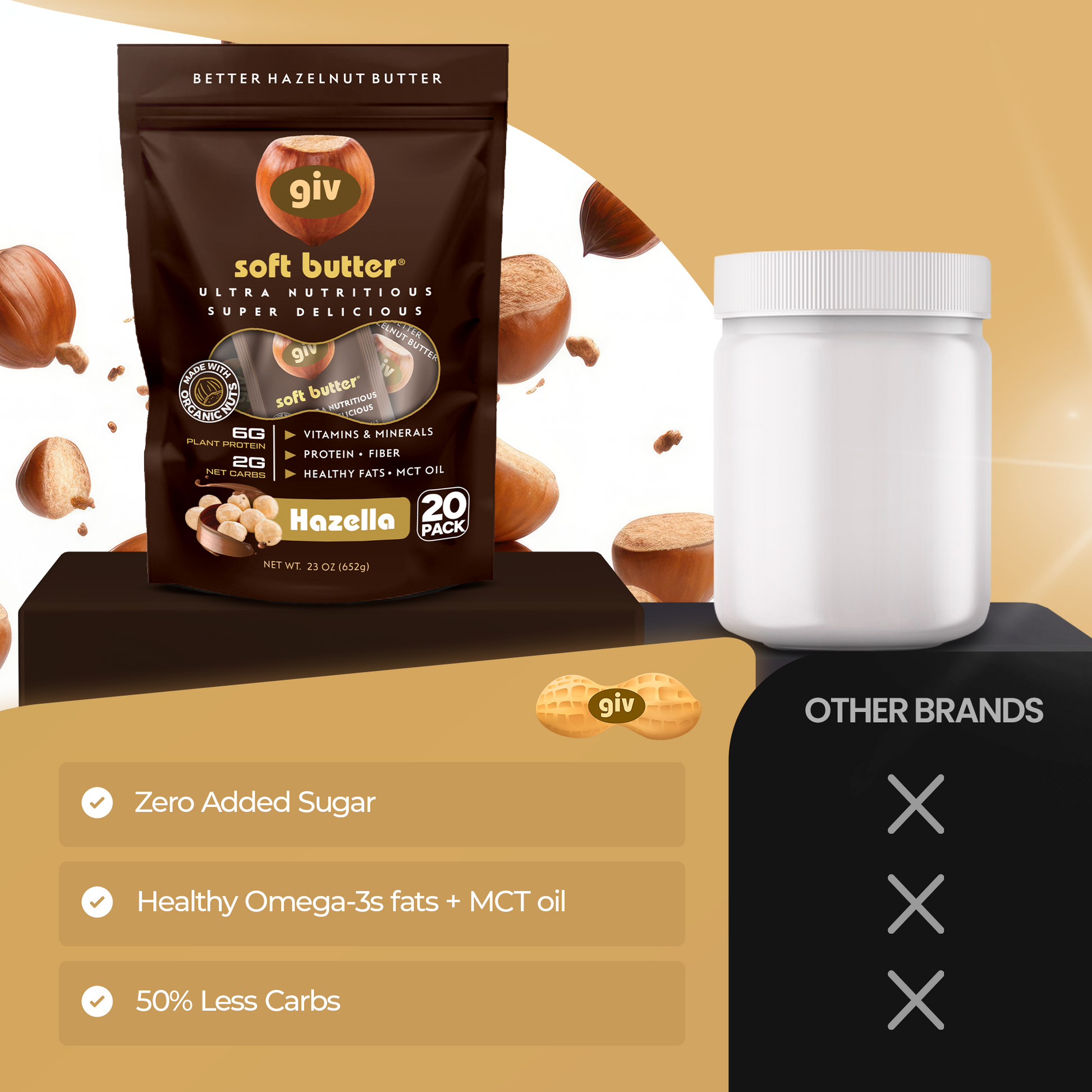 giv is keto friendly with no added sugar and only 1g of naturally occurring sugar per serving. Using low carb nuts, giv has over 50% less carbs than traditional peanut butter with only 2g-3g of carbs per serving depending on the product.