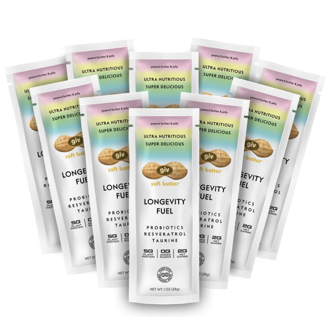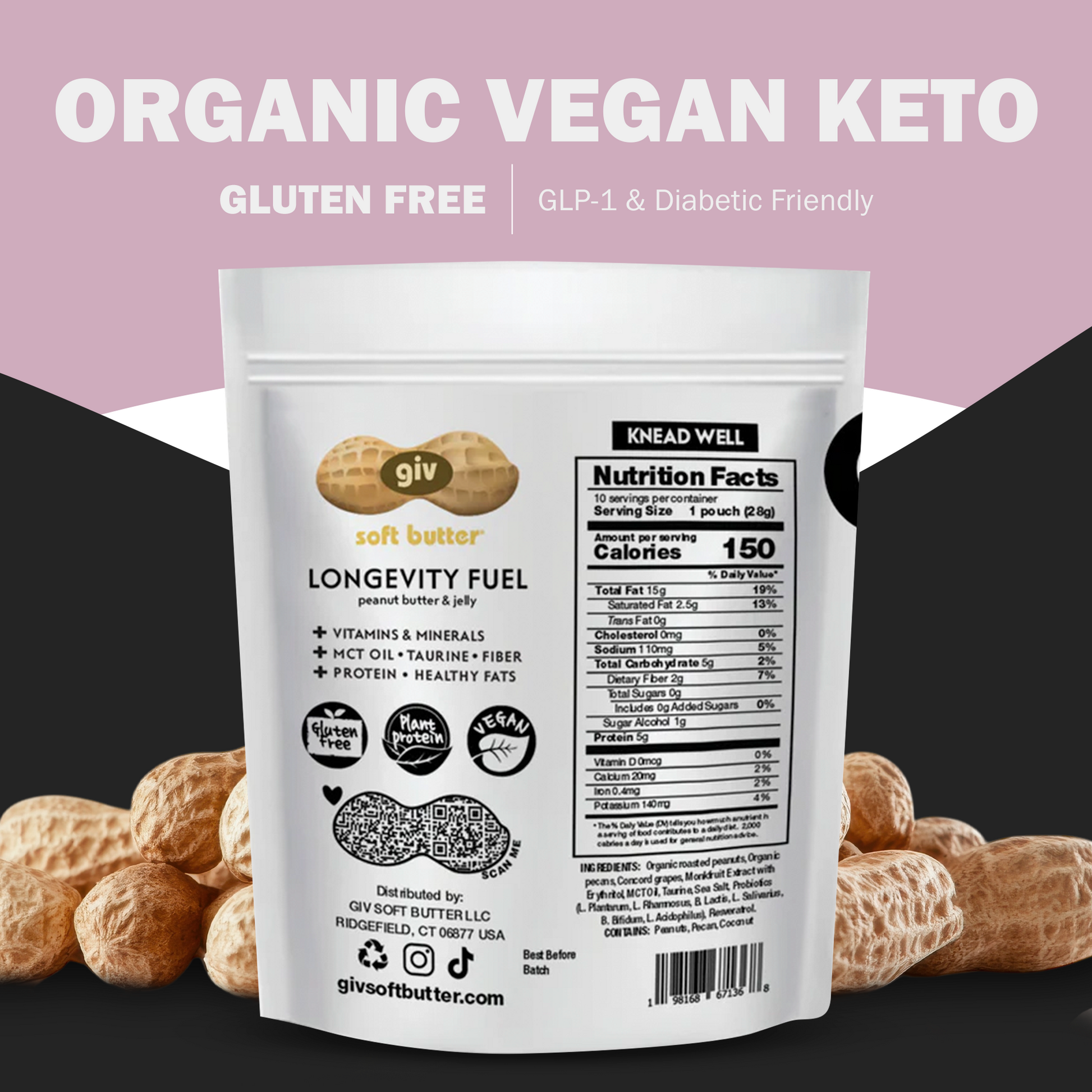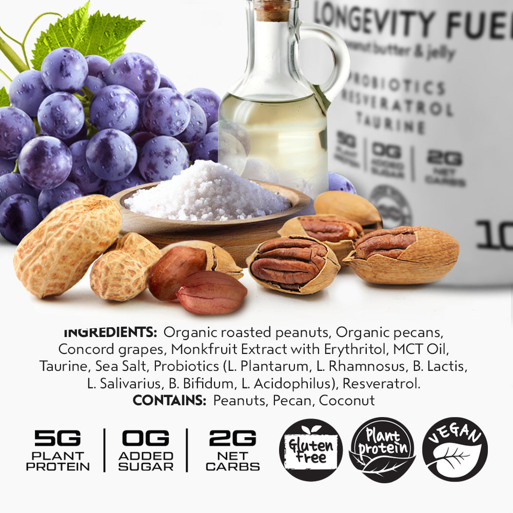 Our Longevity Fuel is designed with your health span in mind. Classic Peanut Butter of roasted peanuts blended with pecans infused with Concord grape and MCT oil, creates a rich, sweet and salty, mouth watering, peanut butter for sports nutrition with the added longevity benefits of taurine, probiotics and resveratrol. With no added sugar, this gluten-free organic peanut butter is glp-1 friendly, low carb and keto and diabetic friendly. 10 pack of 1oz pouches.