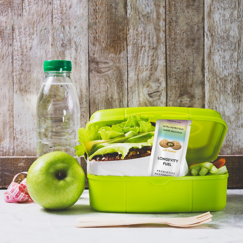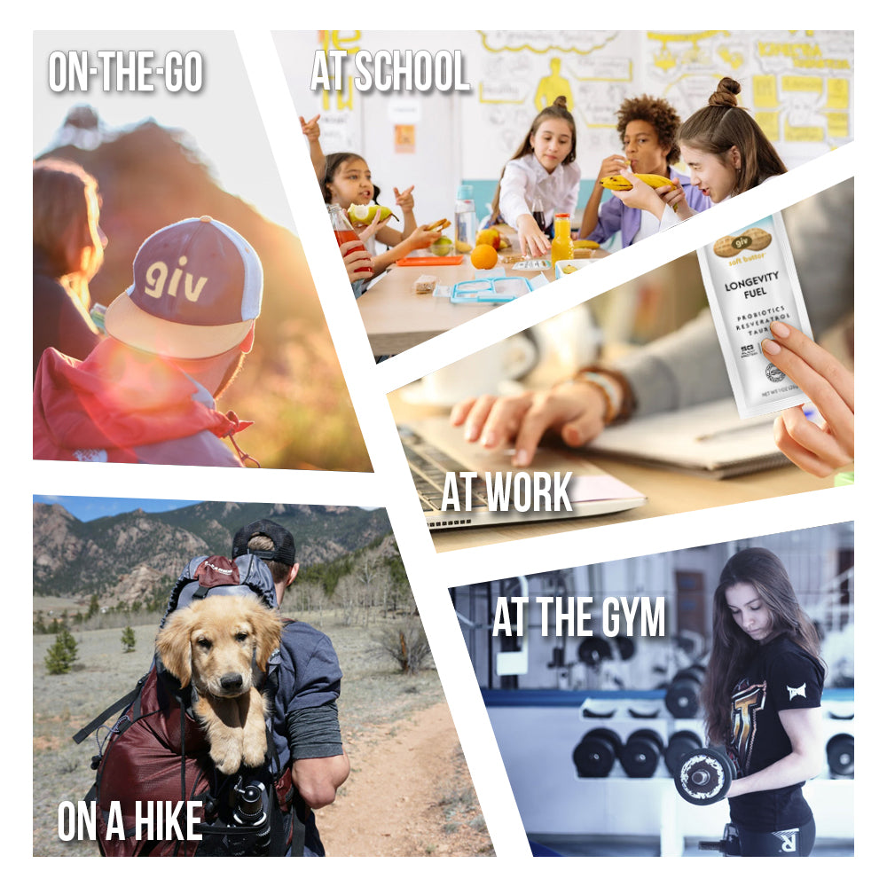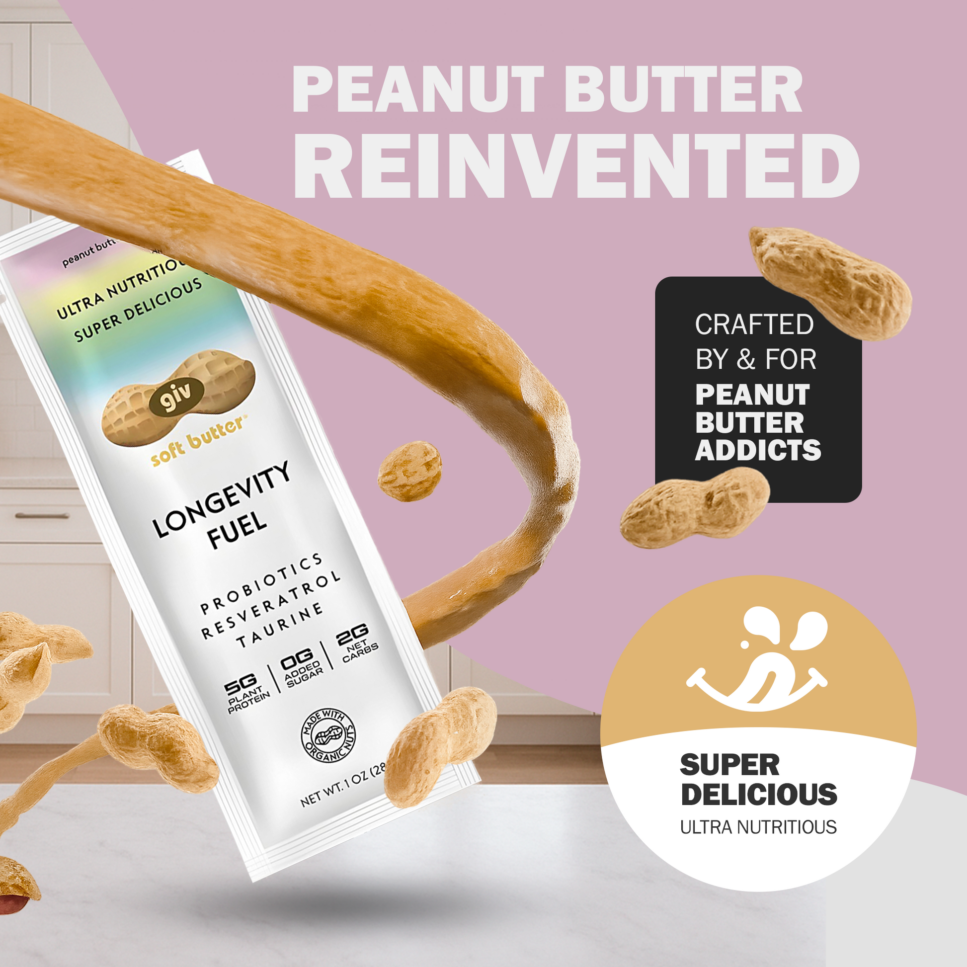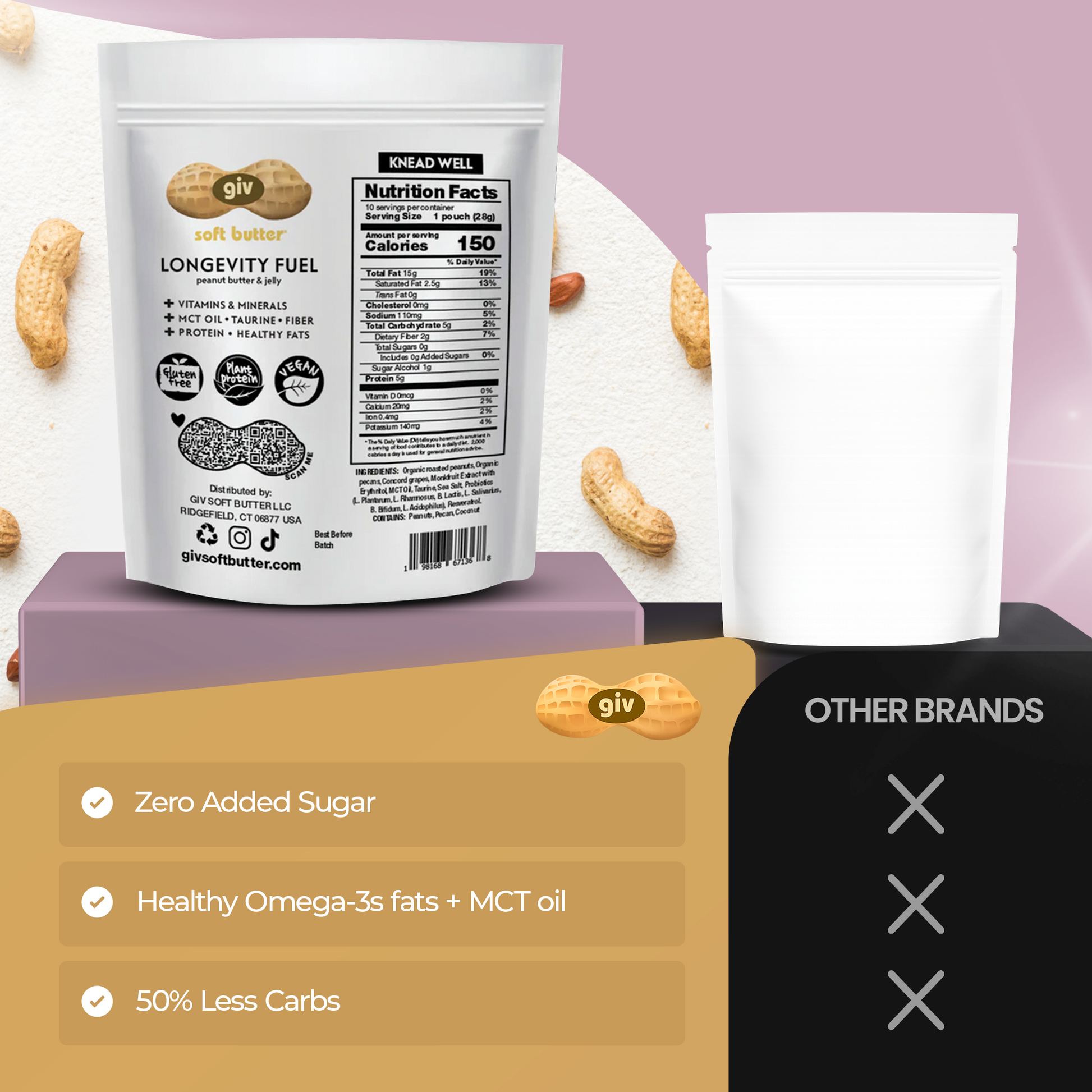 Our Longevity Fuel is designed with your health span in mind. Classic Peanut Butter of roasted peanuts blended with pecans infused with Concord grape and MCT oil, creates a rich, sweet and salty, mouth watering, peanut butter for sports nutrition with the added longevity benefits of taurine, probiotics and resveratrol. With no added sugar, this gluten-free organic peanut butter is glp-1 friendly, low carb and keto and diabetic friendly. 10 pack of 1oz pouches.