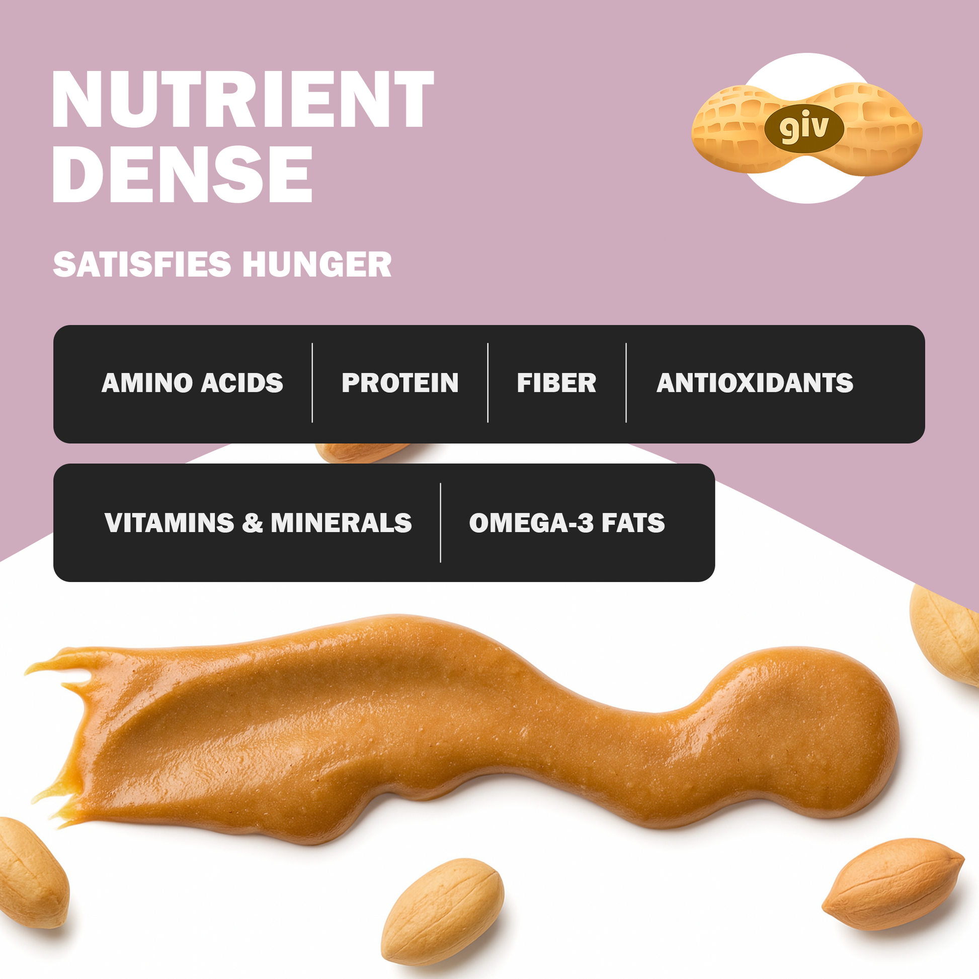 giv is keto friendly with no added sugar and only 1g of naturally occurring sugar per serving. Using low carb nuts, giv has over 50% less carbs than traditional peanut butter with only 2g-3g of carbs per serving depending on the product.