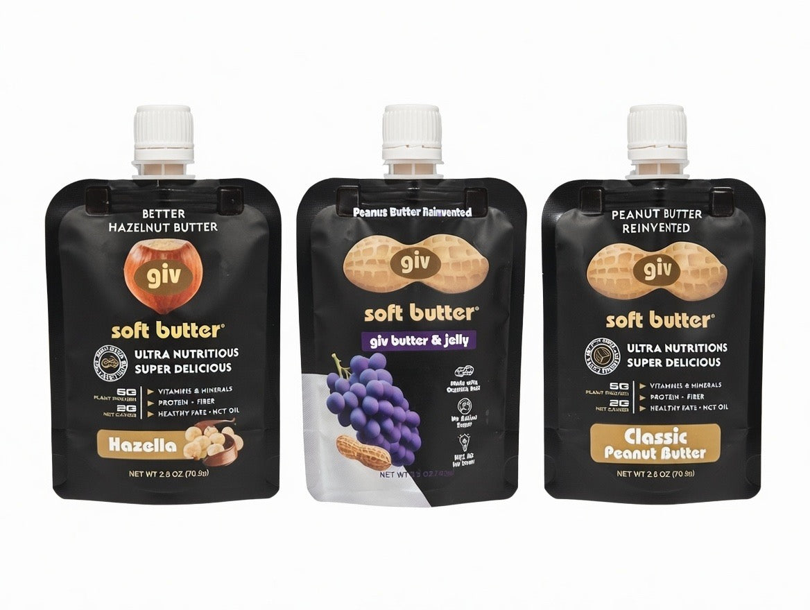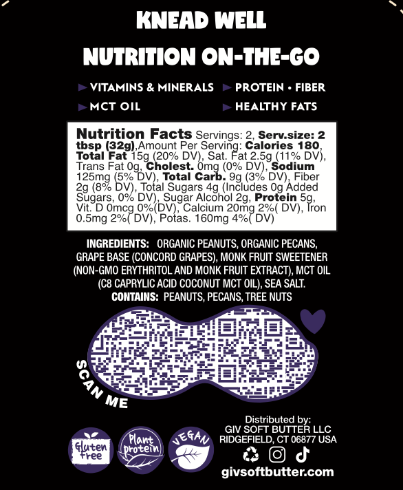 1 GB&J pouch- Peanut butter reinvented. gb&j the new way. Roasted peanuts blended with pecans infused with Concord grape and MCT oil, creates a familiar comfort food, upgraded.